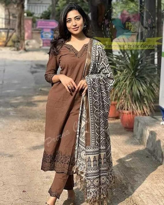 Go pixi Women Pure Cotton Embroidery Straight Kurti with Pant & Dupatta Set (Brown)